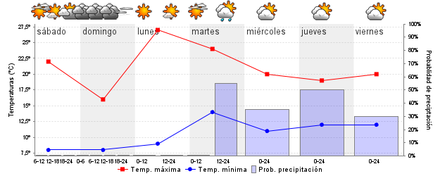 | Temperatura mín./máx. (ºC) | 8 / 21 | 8 / 16 | 9 / 27 | 15 / 24 | 11 / 19 | 12 / 18 | ||||