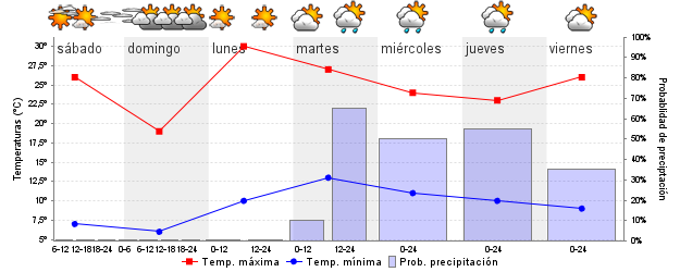 | Temperatura mín./máx. (ºC) | 8 / 26 | 6 / 19 | 10 / 30 | 13 / 26 | 11 / 24 | 10 / 22 | ||||