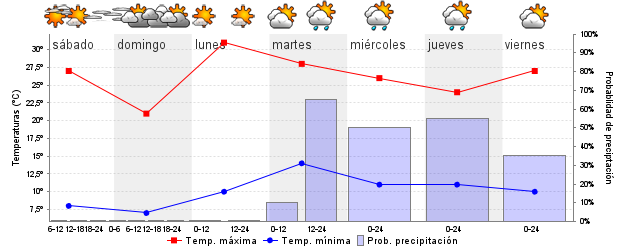 | Temperatura mín./máx. (ºC) | 8 / 27 | 7 / 21 | 10 / 31 | 13 / 28 | 12 / 25 | 11 / 23 | ||||