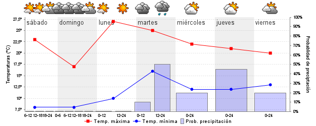 | Temperatura mín./máx. (ºC) | 8 / 23 | 9 / 17 | 10 / 26 | 15 / 24 | 13 / 21 | 12 / 20 | ||||
