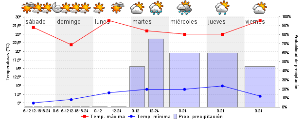 | Temperatura mín./máx. (ºC) | 5 / 27 | 6 / 22 | 8 / 29 | 9 / 27 | 9 / 25 | 9 / 24 | ||||