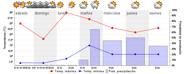 | Temperatura mín./máx. (ºC) | 7 / 25 | 7 / 18 | 9 / 30 | 14 / 26 | 11 / 22 | 11 / 21 | ||||