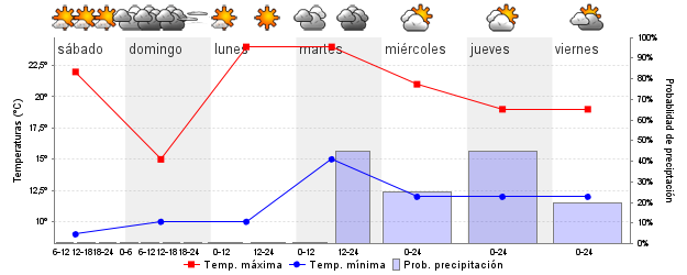 | Temperatura mín./máx. (ºC) | 8 / 22 | 10 / 15 | 10 / 24 | 15 / 23 | 13 / 20 | 12 / 19 | ||||