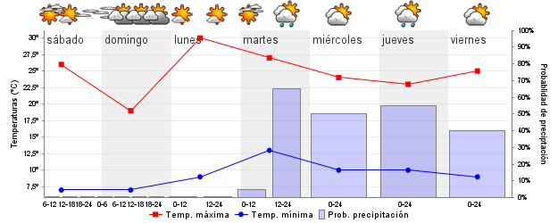 | Sens. térmica mín./máx. (ºC) | 7 / 26 | 6 / 19 | 9 / 30 | 13 / 27 | 11 / 24 | 11 / 22 | ||||