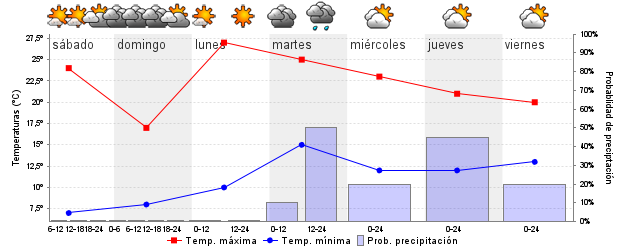 | Temperatura mín./máx. (ºC) | 8 / 24 | 8 / 17 | 10 / 27 | 15 / 24 | 13 / 21 | 12 / 21 | ||||