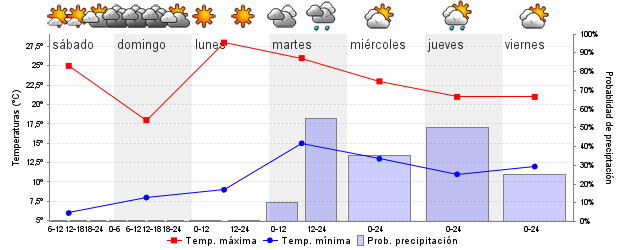 | Temperatura mín./máx. (ºC) | 7 / 24 | 8 / 17 | 9 / 28 | 15 / 25 | 13 / 22 | 12 / 21 | ||||