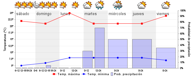 | Temperatura mín./máx. (ºC) | 5 / 22 | 6 / 21 | 8 / 24 | 8 / 22 | 8 / 21 | 8 / 20 | ||||