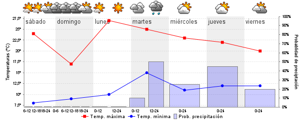 | Temperatura mín./máx. (ºC) | 8 / 24 | 9 / 17 | 10 / 27 | 14 / 24 | 12 / 21 | 12 / 21 | ||||