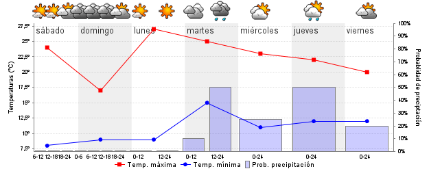 | Temperatura mín./máx. (ºC) | 7 / 24 | 9 / 17 | 10 / 27 | 14 / 25 | 12 / 21 | 12 / 21 | ||||