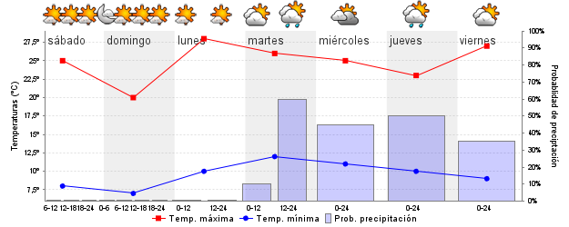 | Temperatura mín./máx. (ºC) | 8 / 25 | 7 / 20 | 10 / 28 | 12 / 26 | 11 / 24 | 11 / 22 | ||||