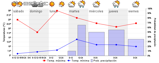 | Temperatura mín./máx. (ºC) | 6 / 24 | 7 / 18 | 8 / 29 | 14 / 27 | 12 / 22 | 12 / 21 | ||||