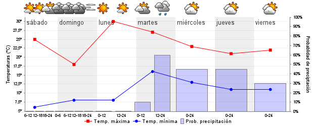 | Temperatura mín./máx. (ºC) | 7 / 25 | 8 / 18 | 8 / 30 | 15 / 25 | 14 / 22 | 11 / 21 | ||||