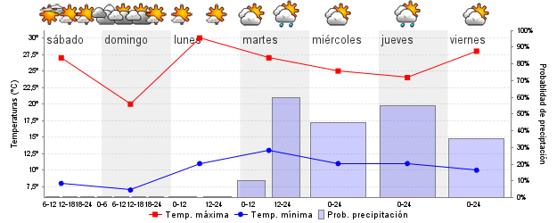 | Temperatura mín./máx. (ºC) | 9 / 26 | 7 / 20 | 11 / 30 | 13 / 27 | 12 / 25 | 11 / 23 | ||||