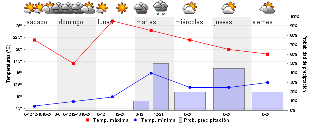 | Temperatura mín./máx. (ºC) | 8 / 22 | 9 / 16 | 10 / 26 | 15 / 23 | 13 / 20 | 12 / 20 | ||||