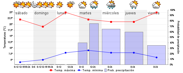 | Temperatura mín./máx. (ºC) | 4 / 22 | 5 / 19 | 8 / 25 | 9 / 23 | 7 / 21 | 8 / 20 | ||||