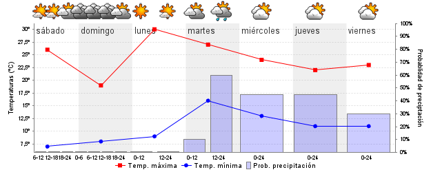 | Temperatura mín./máx. (ºC) | 7 / 26 | 8 / 19 | 9 / 30 | 15 / 25 | 14 / 23 | 11 / 21 | ||||