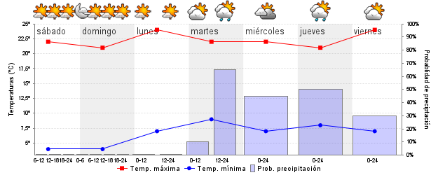 | Temperatura mín./máx. (ºC) | 4 / 21 | 4 / 19 | 7 / 24 | 8 / 23 | 8 / 21 | 8 / 19 | ||||