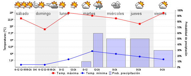 | Temperatura mín./máx. (ºC) | 6 / 23 | 6 / 18 | 8 / 25 | 11 / 23 | 10 / 23 | 10 / 20 | ||||