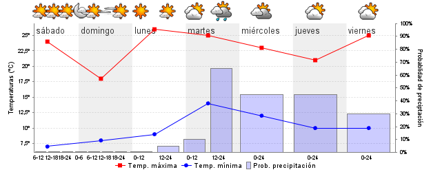 | Temperatura mín./máx. (ºC) | 7 / 24 | 7 / 18 | 10 / 26 | 13 / 24 | 13 / 23 | 12 / 21 | ||||
