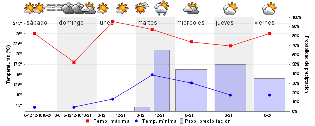 | Temperatura mín./máx. (ºC) | 8 / 25 | 7 / 18 | 10 / 28 | 14 / 25 | 12 / 23 | 12 / 21 | ||||