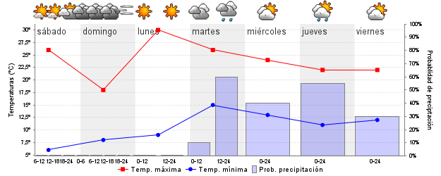 | Temperatura mín./máx. (ºC) | 6 / 26 | 8 / 18 | 9 / 30 | 15 / 25 | 13 / 23 | 11 / 22 | ||||