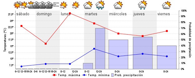 | Sens. térmica mín./máx. (ºC) | 6 / 22 | 7 / 16 | 9 / 27 | 14 / 25 | 12 / 20 | 12 / 19 | ||||