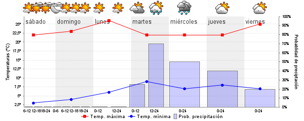 | Temperatura mín./máx. (ºC) | 3 / 21 | 4 / 23 | 7 / 25 | 7 / 23 | 7 / 21 | 8 / 21 | ||||