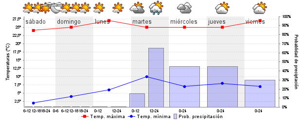 | Temperatura mín./máx. (ºC) | 2 / 24 | 4 / 25 | 6 / 27 | 9 / 26 | 8 / 23 | 8 / 24 | ||||