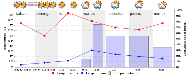 | Temperatura mín./máx. (ºC) | 6 / 26 | 7 / 20 | 8 / 30 | 14 / 28 | 11 / 24 | 11 / 23 | ||||