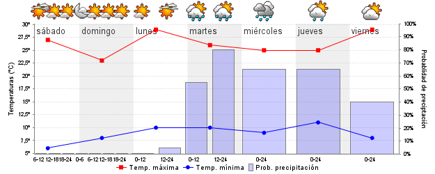 | Temperatura mín./máx. (ºC) | 7 / 26 | 7 / 24 | 10 / 28 | 10 / 26 | 10 / 25 | 10 / 24 | ||||