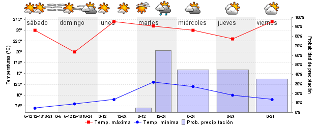 | Temperatura mín./máx. (ºC) | 7 / 25 | 7 / 20 | 10 / 27 | 13 / 25 | 12 / 24 | 12 / 22 | ||||