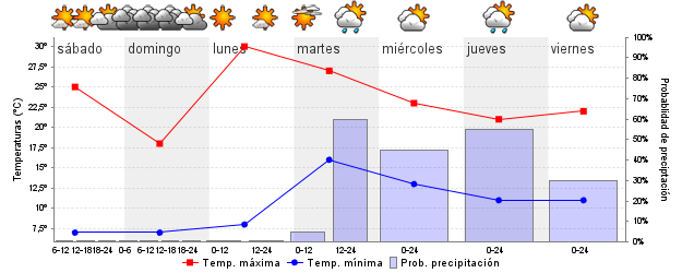 | Temperatura mín./máx. (ºC) | 7 / 24 | 8 / 18 | 8 / 30 | 15 / 25 | 12 / 22 | 11 / 21 | ||||